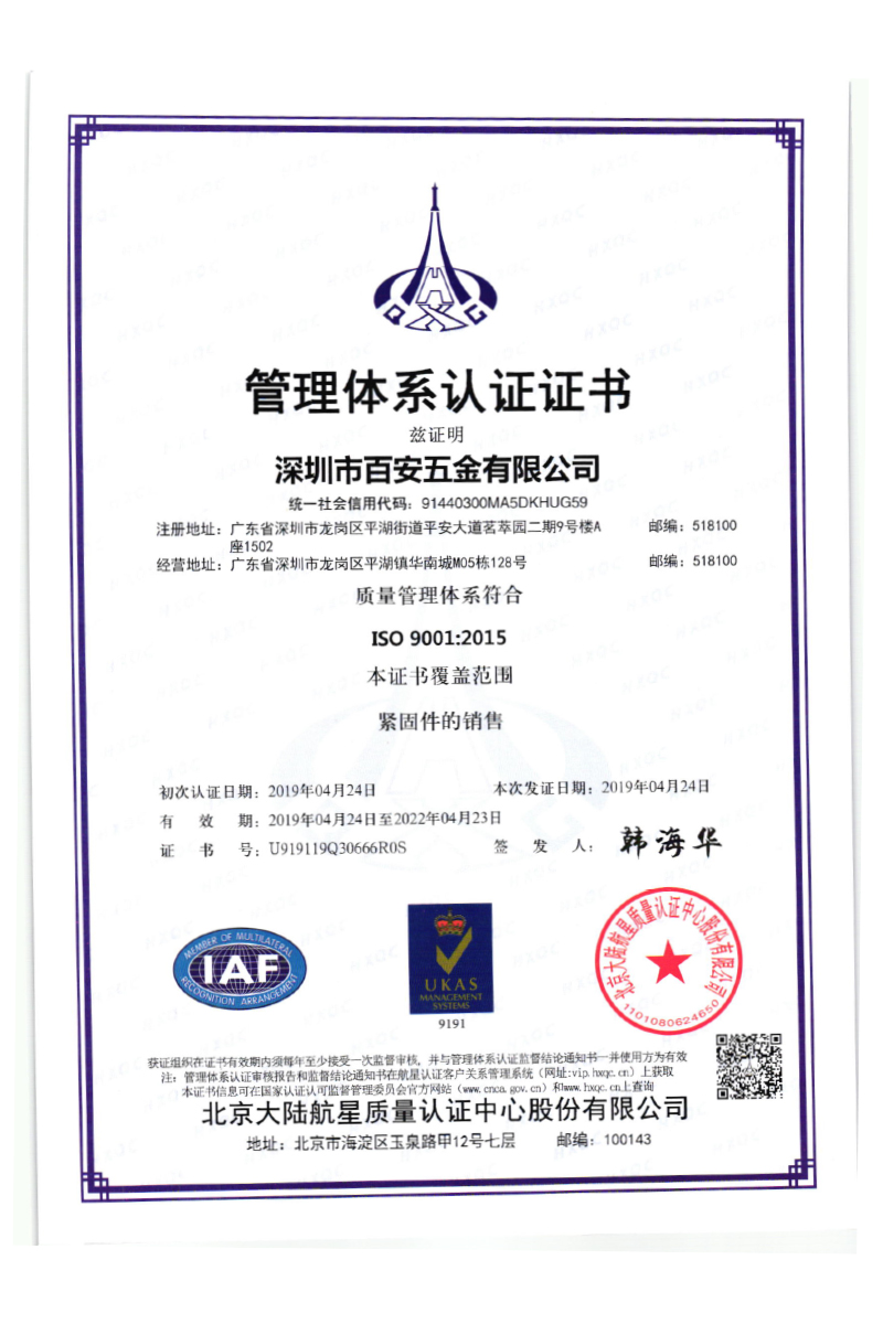 深圳市百安五金ISO認(rèn)證
